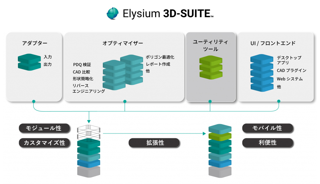 Elysium 3D-SUITEはこれまで定評のある複数のトランスレータ製品を統合することで、高品質な3Dデータ変換・最適化機能を柔軟な組み合わせで使用できるようにした製品です。