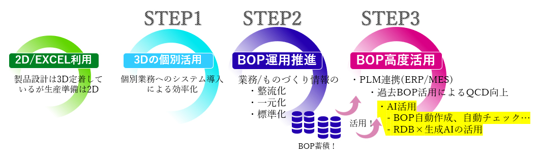 BOPはBill of Processの略で、製品の組み立てで使用する部品や作業手順、場所、設備、治工具、製造ノウハウなどを作業工程に紐づけた生産情報です。このBOPを3Dデータと融合させたデータモデルを3D-BOPと定義。