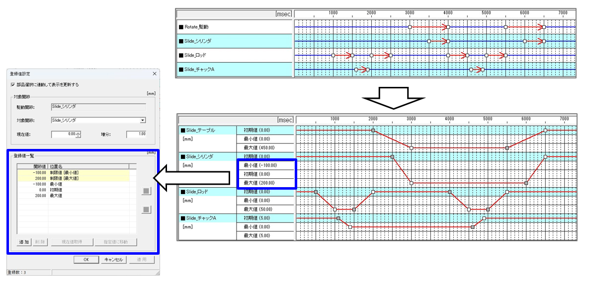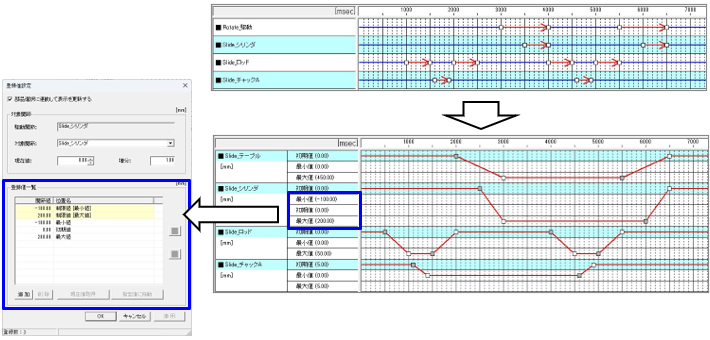 今回、チャートの値行にV20L22で追加した関節登録値機能のポジションリストを導入することで、チャートの線図表現を実現し、メカの動きがイメージしやすくなりました。(図1)